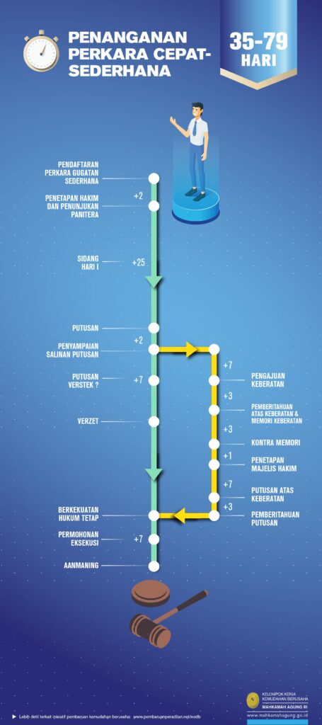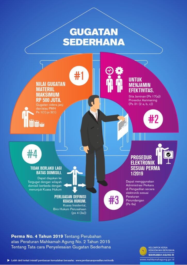 Dasar Hukum : Peraturan Mahkamah Agung No. 4 Tahun2019 tentang Perubahan Atas Peraturan Mahkamah Agung Nomor 2 Tahun 2015 tentang Tata Cara Penyelesaian Gugatan Sederhana. [Download]